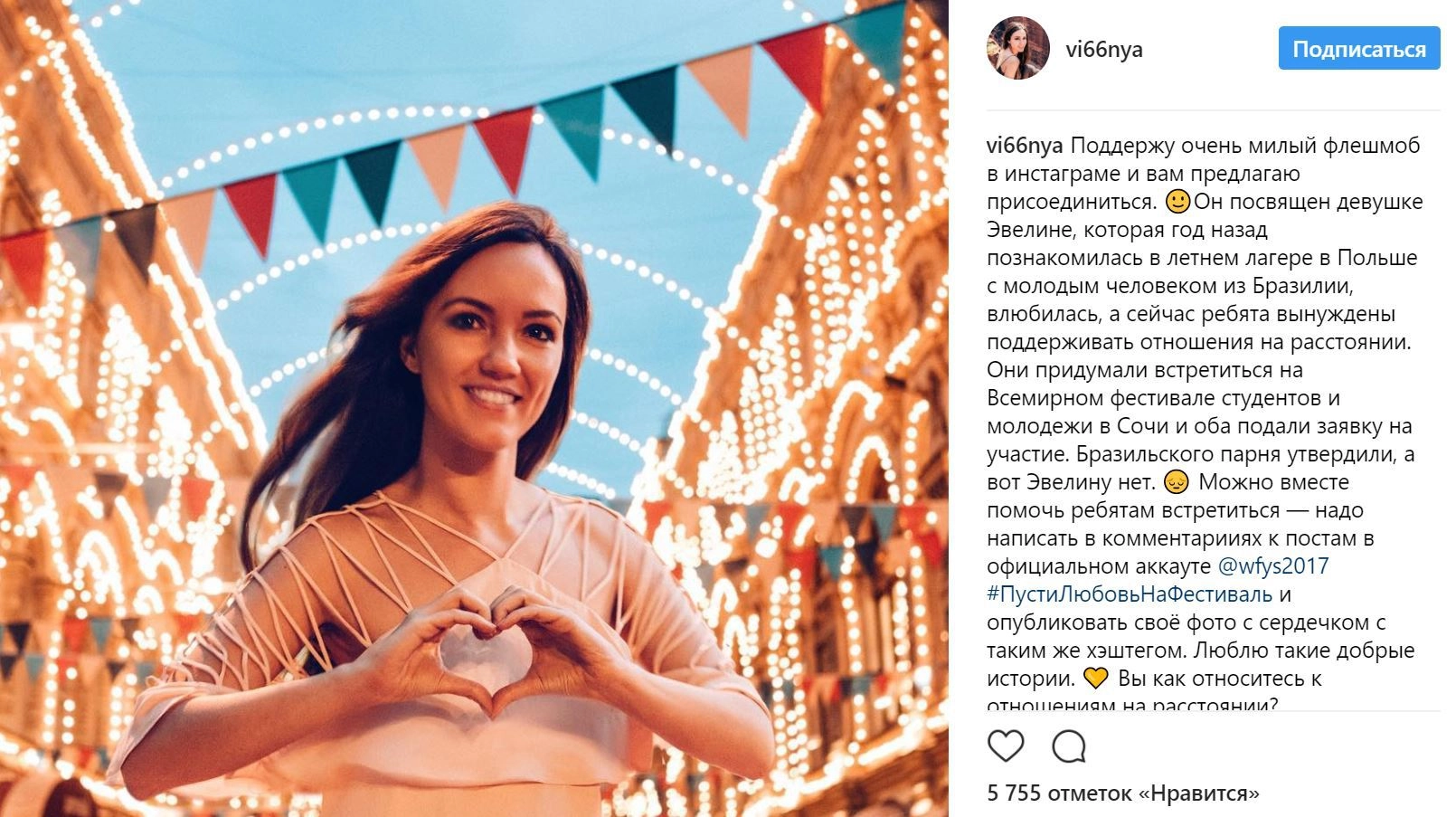 «Настоящий случай из бразильского сериала. Давайте поможем Эвелине и ее молодому человеку встретиться?! Накидайте комментарии к постам в официальном аккаунте фестиваля @wfys2017 с хештегом #ПустиЛюбовьНаФестиваль и опубликуйте свое фото с сердечком с тегом #ПустиЛюбовьНаФестиваль. Пусть в мире станет на два счастливых человека больше», — написала Хилькевич.