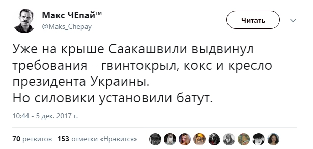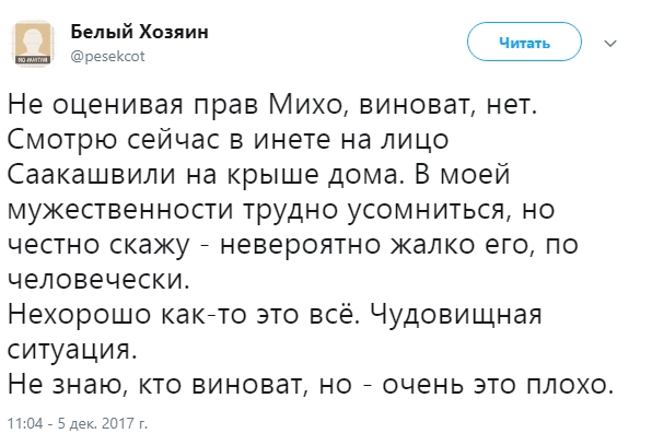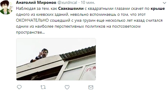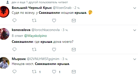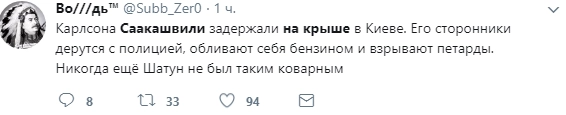 «Истерит как базарная баба — это провал… помню какими глазами смотрела на него раньше — ничего не понимаю», «сыкун» «Михо не пропадёт! А украинцам надо резиденцию пороха брать давно, а не за Саакашвили бегать», «Он совсем потерял чувство реальности, к сожалению», «Михо сильный. Давно мог в бабках купаться, но человек определенных принципов, нельзя его не уважать за это», — отреагировали пользователи.