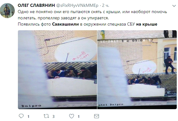 Пресс-секретарь российского президента Дмитрий Песков с сарказмом прокомментировал действия Саакашвили, отметив его тернистый путь — «от поедания галстука до залезания на крышу». Также Песков заявил, что в Кремле «не привыкли реагировать на заявления людей, которые сидят на крыше».