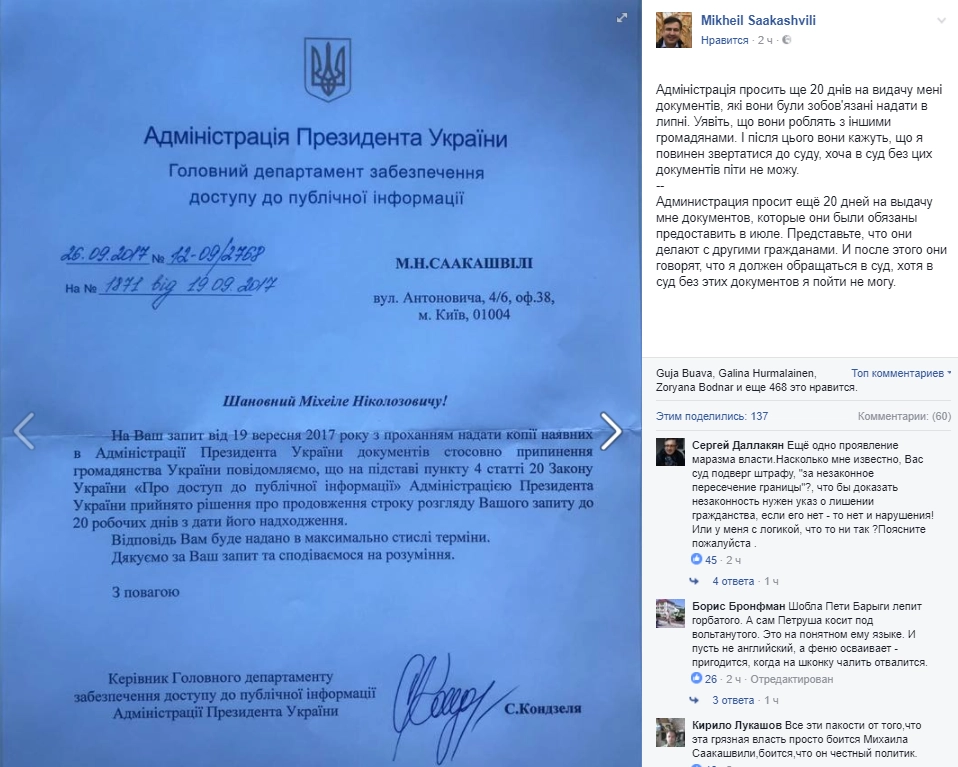 Политик также поместил в соцсети фото ответа администрации президента на свой запрос о предоставлении копии документов о лишении гражданства.