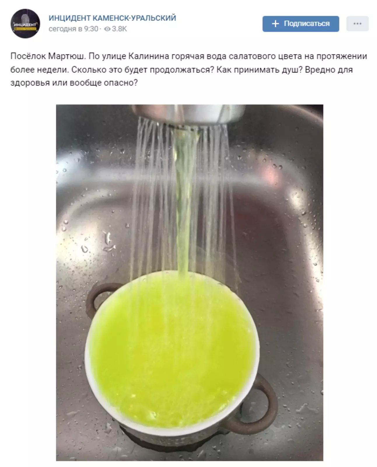24 ноября в социальных сетях появились публикации о необычном цвете горячей воды, поступающей из водопроводного края одного из жителей уральского поселка. Сообщалось, что жители улицы Калинина в Мартюше живут с салатовой водой уже несколько дней.
