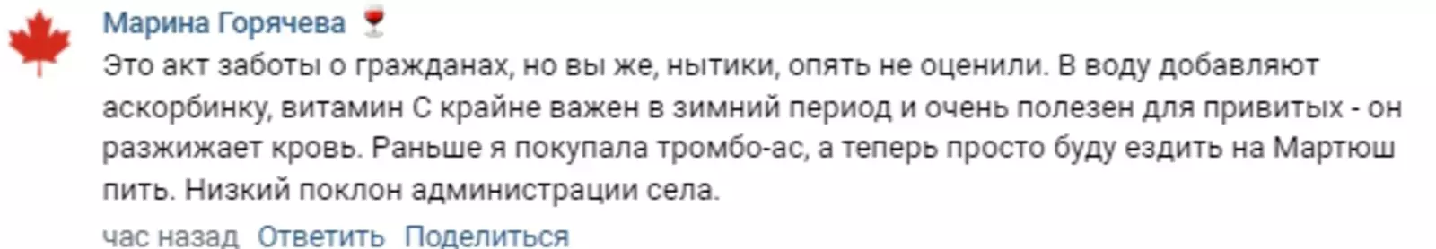 Экзотический цвет воды в Мартюше неизбежно вызвал у комментаторов в Рунете вал шуток про «газировку», «минералку» и напиток с «витаминами» прямо из крана. Пользователи сообщали также, что зеленая водопроводная вода встречается и в старых районах ближайшего крупного города — Каменска-Уральского.