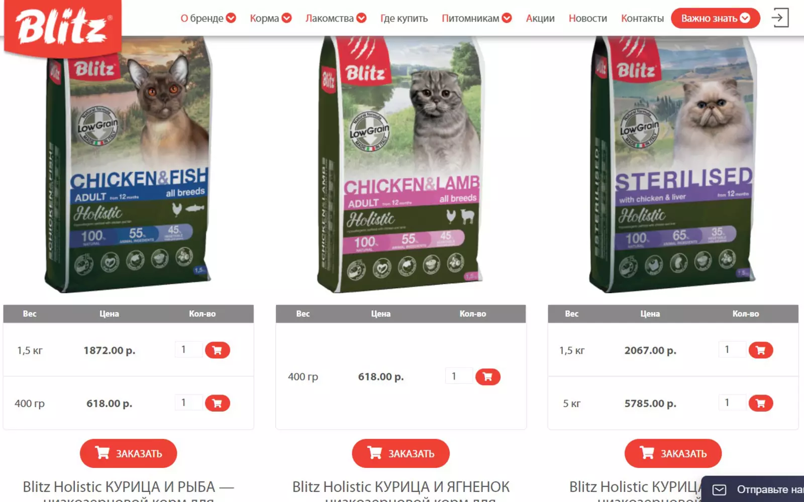 В кормах Blitz сбалансированный и подробно расписанный на упаковке и официальном сайте состав, широкая линейка сухих и влажных кормов для разных кошек, в том числе стерилизованных, аллергиков и с чувствительным пищеварением, разнообразные вкусы. Все рационы сбалансированы и содержат оптимальное для животного количество белка, жиров и углеводов, а также витамины, минералы и пробиотики. Сухие корма Blitz доступны в фасовках 400 граммов (такую упаковку можно взять на пробу), 1,5 килограмма, 2 килограмма и 10 килограммов.