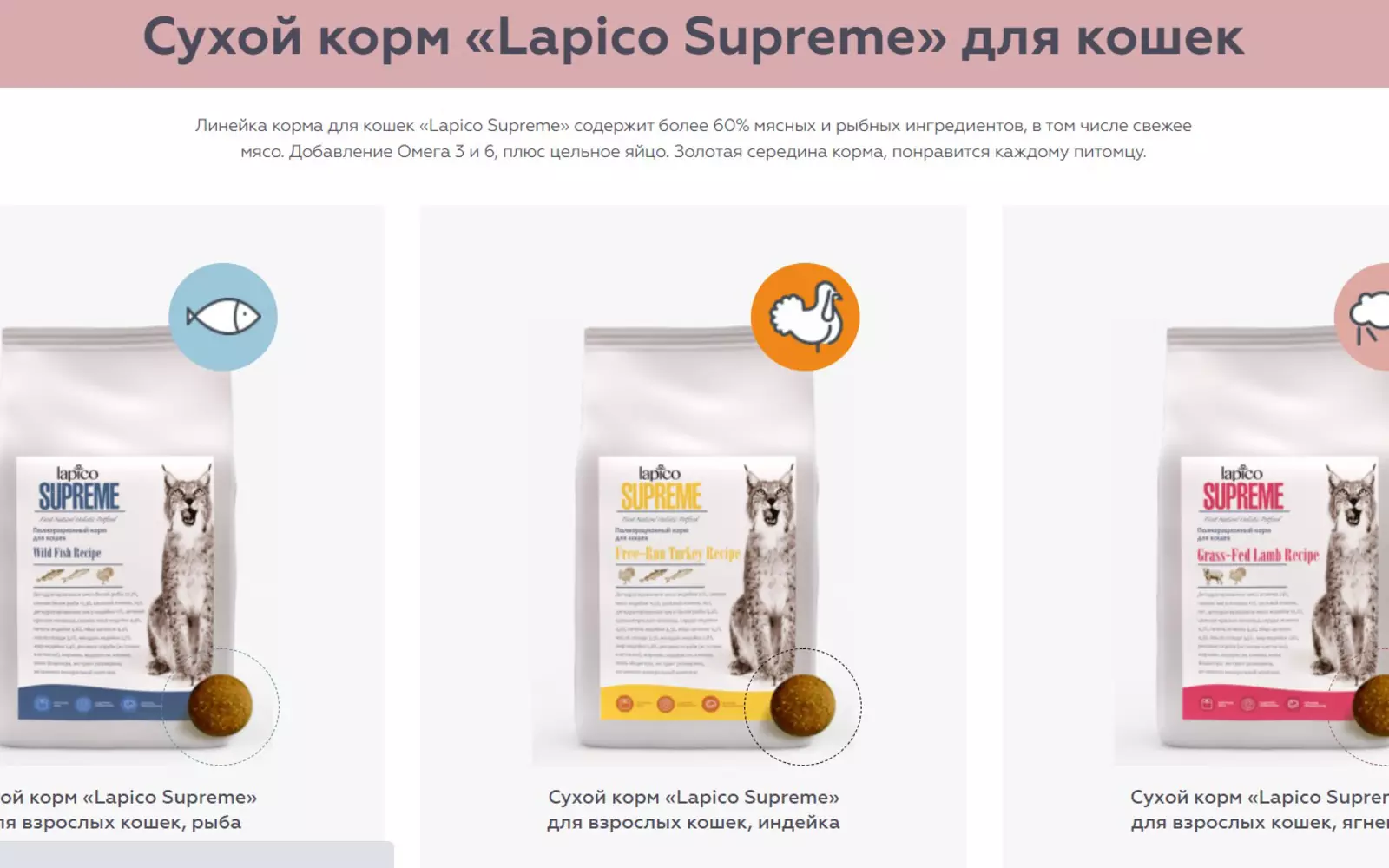 Этот производитель выпускает линейку кормов только для взрослых нестерилизованных кошек, но рацион с ягненком также может подойти кошкам с пищевой аллергией. У кормов данного бренда богатый, подробно расписанный состав с большим количеством белка, овощами, ягодами и травами. Некоторых покупателей смущает нут в составе, но его доля не превышает процент мясных ингредиентов, поэтому опасаться этого продукта не стоит. Корма Lapico доступны в упаковке по 400 граммов, два килограмма и восемь килограммов. Любую фасовку можно найти на Ozon.