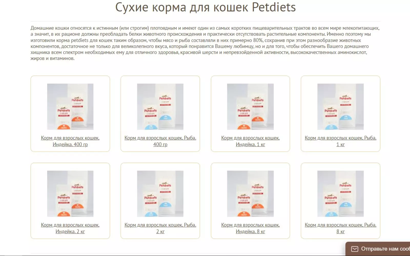 Большое преимущество кормов Petdiets — невысокая калорийность и сниженное количество фосфора, что очень важно для здоровья стерилизованных животных. Состав рационов — разнообразный, сбалансированный и подробный. Petdiets можно приобрести на маркетплейсе Ozon и в интернет-магазине Pavik, но он доставляет товары только по Москве и Московской области.