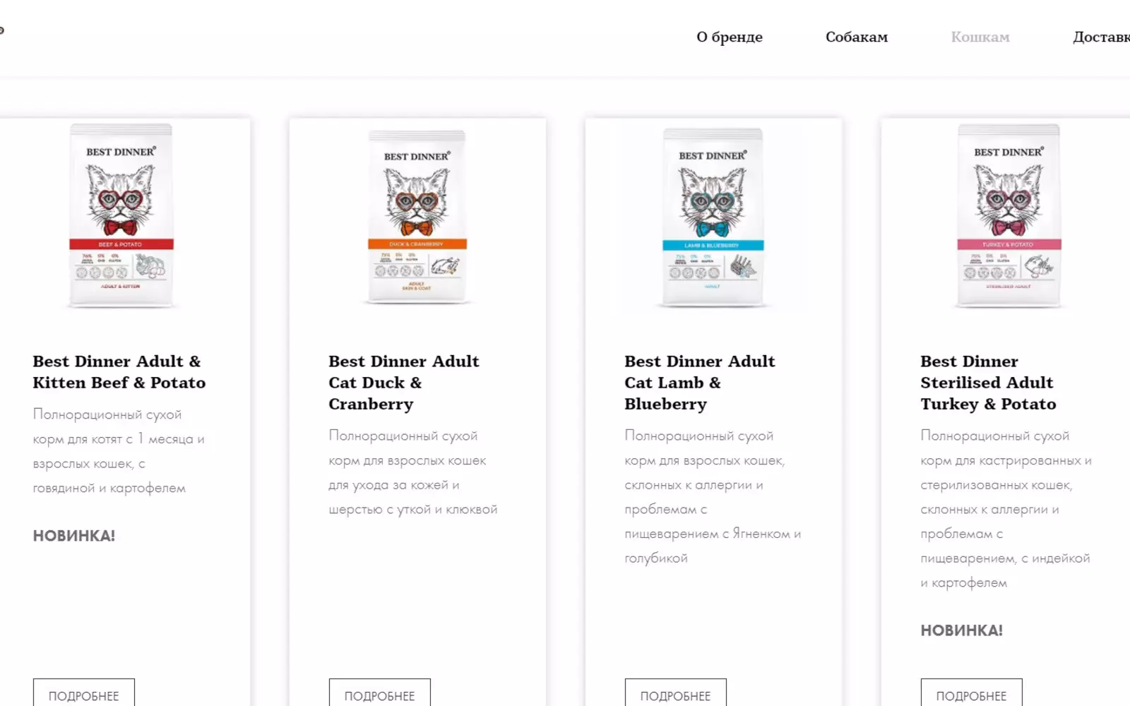 Среди рационов Best Dinner можно найти корма для взрослых кошек и котят, кормящих мам и малышей до двух месяцев, стерилизованных животных, а также питомцев с заболеваниями ЖКТ и мочеполовой системы. Состав всех кормов доступно и подробно изложен как на упаковке, так и на официальном сайте. Купить корма Best Dinner можно в интернет-магазине производителя, но условия доставки разные, поэтому будьте очень внимательны при оформлении заказа, если решите что-то приобрести.