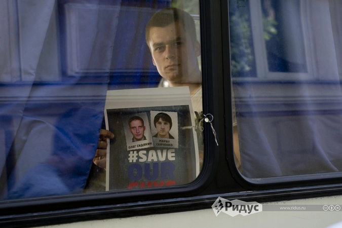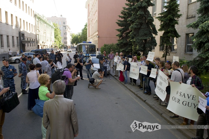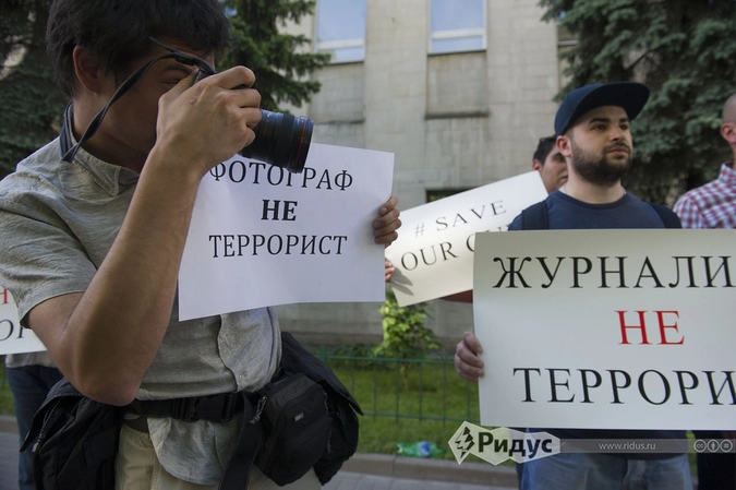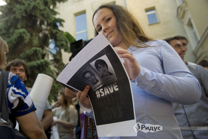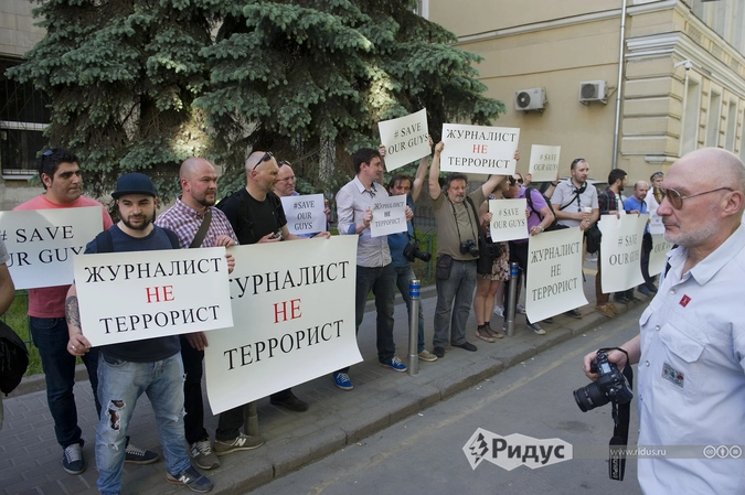 Освободившееся место моментально заняли представители СМИ. Развернулись огромные плакаты, гласившие: «Журналист не террорист» и «#Save Our Guys» – общепринятым твиттер-хэштегом для неравнодушных к ситуации с плененными журналистами пользователей микроблога. Коллеги Сайченко и Сидякина говорили слова поддержки задержанным лайфньюсовцам. «Обвинение в терроризме – это полный бред», звучало со стороны держащих плакаты акул пера.