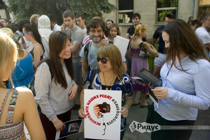 Около трехсот молодых людей присоединились к пикету, затеянному и согласованному с префектурой журналистами российских изданий и международных информационных агентств: РИА «Новости», Reuters, «Известия», «Комсомольская правда», «Собеседник» и других. Средний возраст молодежи можно было определить безошибочно – 15 лет. Образовавшаяся аккурат в 17:00 колонна, вооруженная распечатанными на дешевом принтере плакатами в поддержку плененных украинскими силовиками журналистов, разделила пикет на две части: согласованную и стихийную.