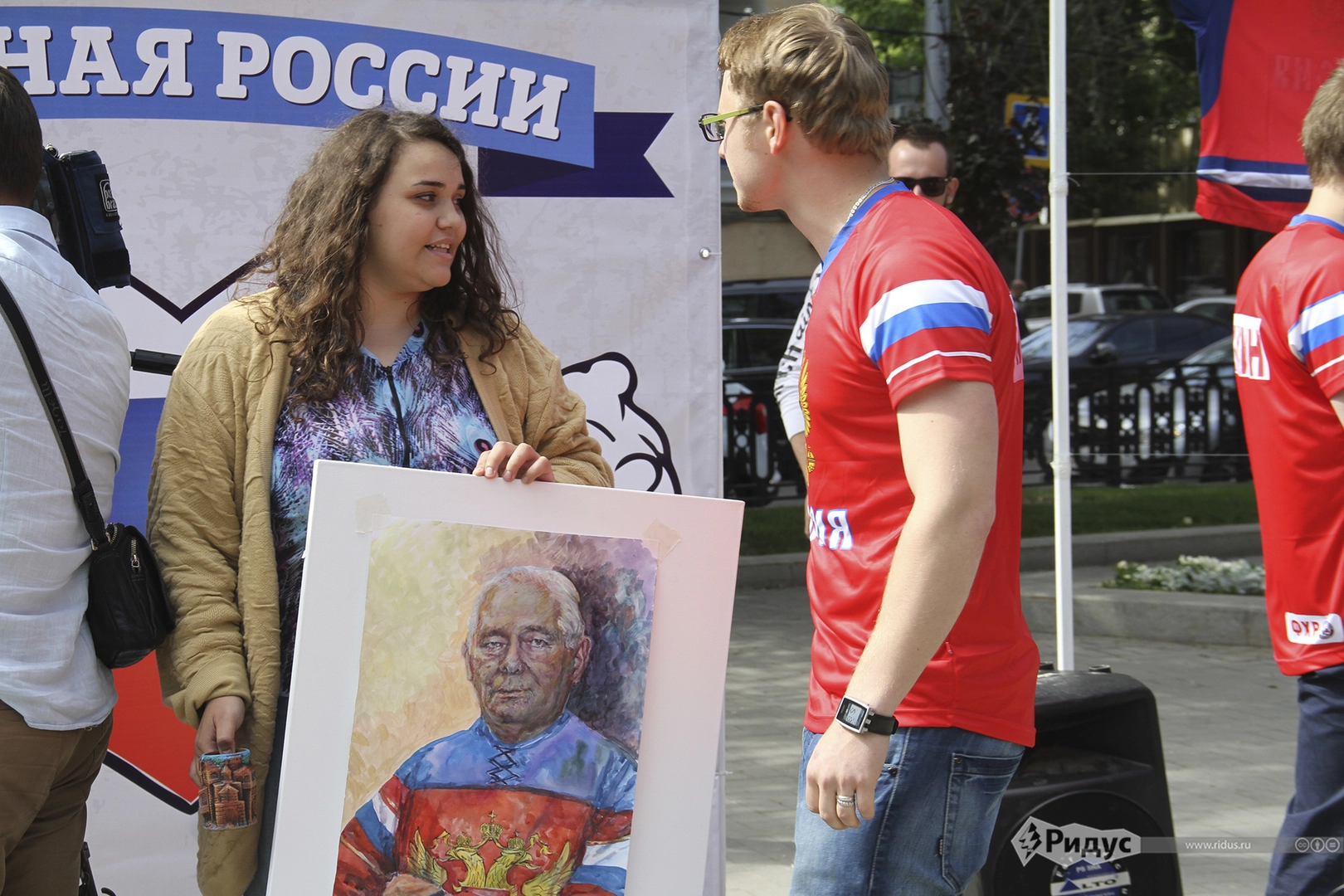 Прямо перед аудиторией молодые художники нарисовали портреты трех новых членов сборной: российского хирурга и педиатра Леонида Рошаля, актера театра и кино Василия Ланового. Третьим стал президент РФ — Владимир Путин. Его портрет аудитории представили уже в конце мероприятия.