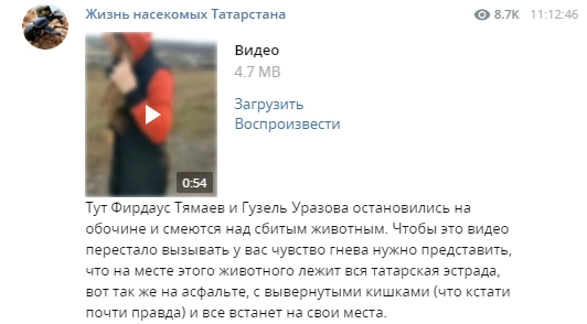 На видеозаписи Уразова и ее коллега, певец из Татарстана Фирдаус Тямаев, обсуждают труп животного, который они заметили, выйдя из машины перекусить по дороге на гастроли.
