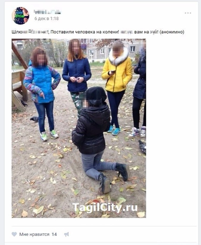 На одном из снимков — компания девушек, по всей видимости, унижает свою сверстницу, которая стоит перед ними на коленях.
