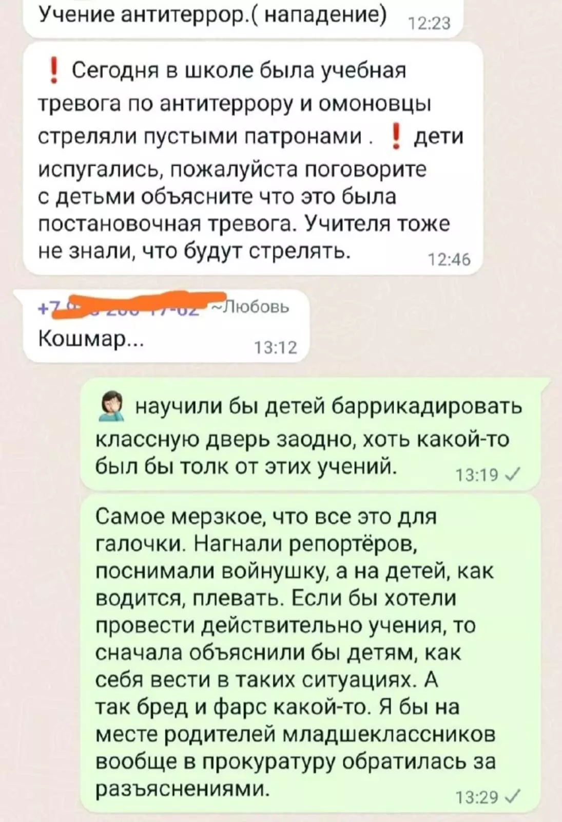 Педагогов предупреждали только о проведении «учебной эвакуации», а не о полновесных учениях в обстановке, приближенной к реальной антитеррористической операции. По данным «Газеты.ру», родители школьников обратились с жалобой на методы проведения учений в управление образования, но там им объявили, что всё прошло как и было задумано: