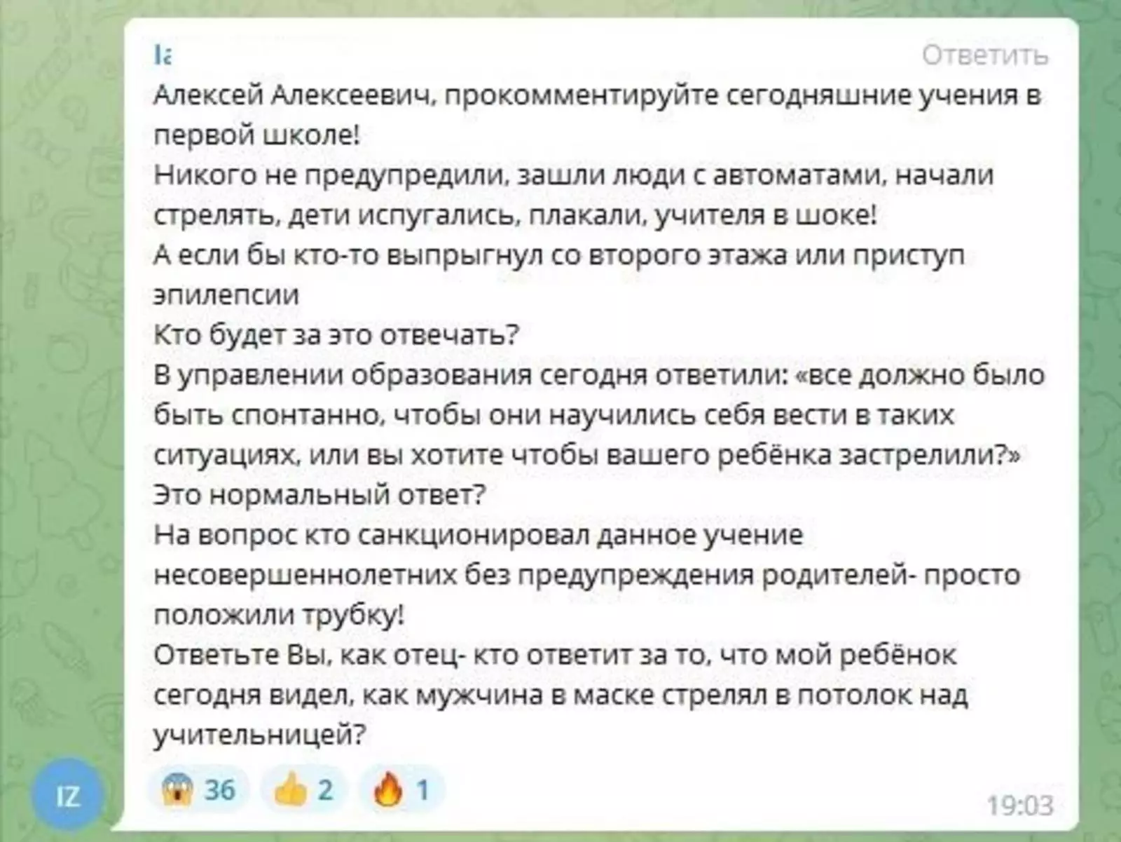 «Все должно было быть спонтанно, чтобы дети научились себя вести в таких ситуациях. Или вы хотите, чтобы вашего ребенка застрелили?»Тем не менее, как сообщает издание «Подъём», городские власти всё же проверят школу № 1 по итогам учений. Мэр Богодистов прямо выступил с критикой любителей реализма: «Не то время сейчас для такой спонтанности».
