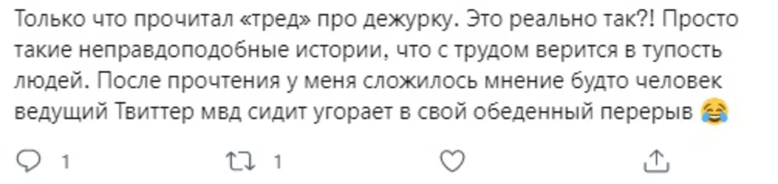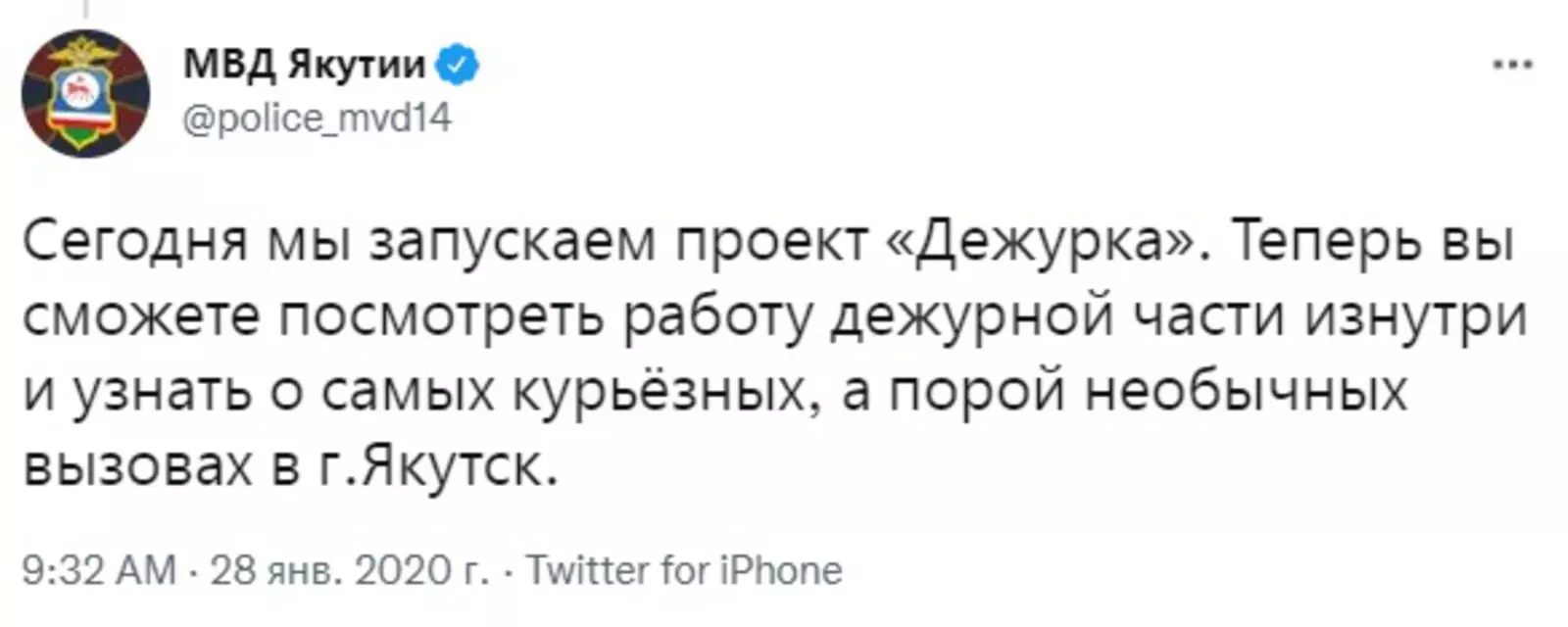 Но окончательно официальный Twitter МВД Якутии нашел свой стиль в прошлом году и с тех пор остается ему верен. В конце января 2020 года в аккаунте был запущен проект «Дежурка» — сообщения о комичных или абсурдных вызовах, поступающих полицейским Якутска.
