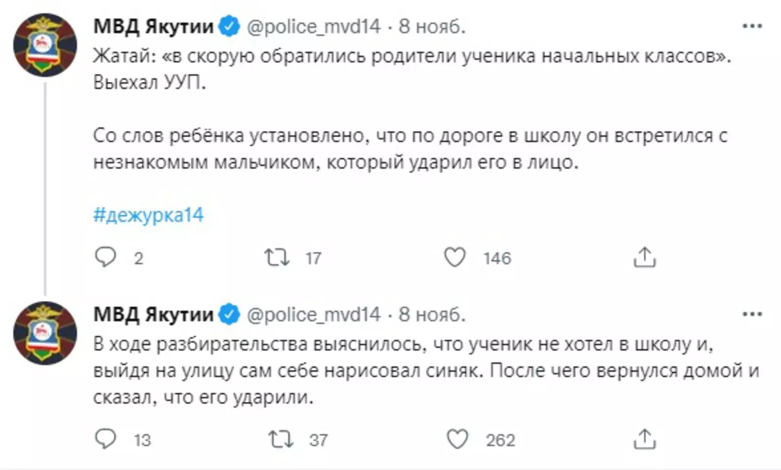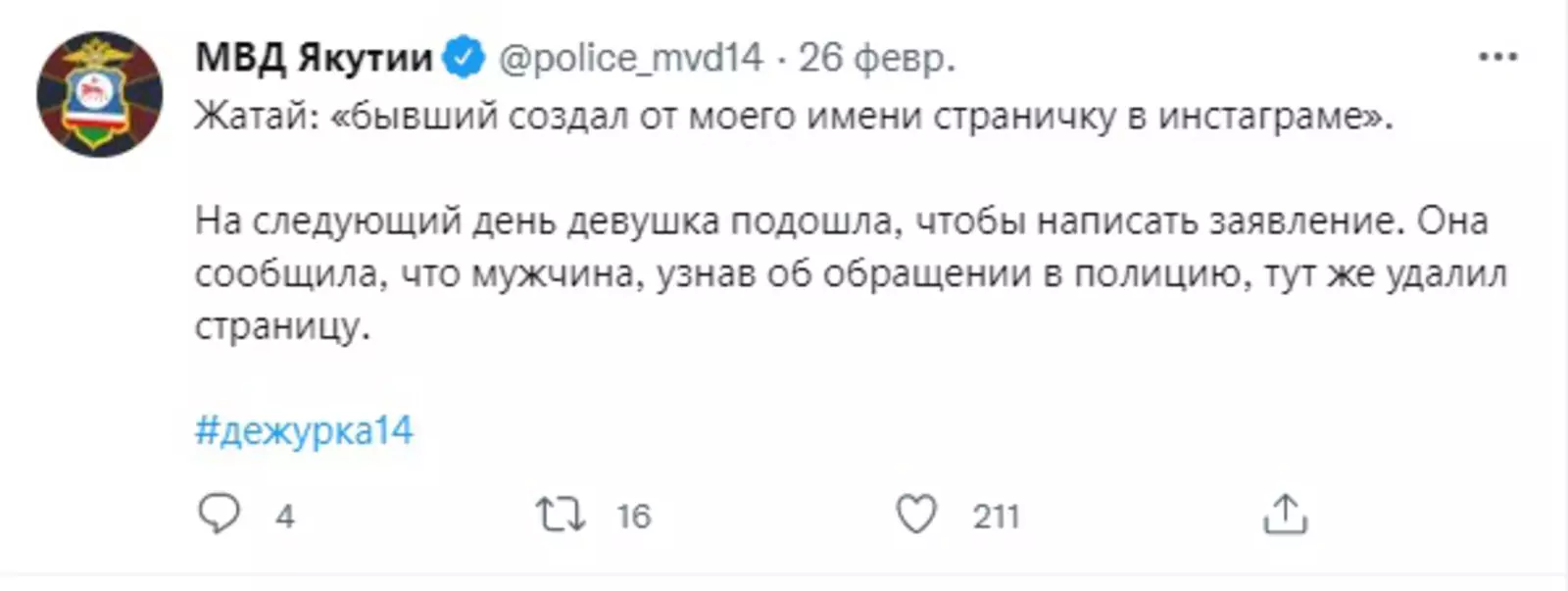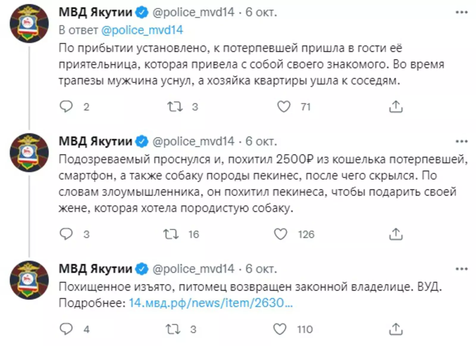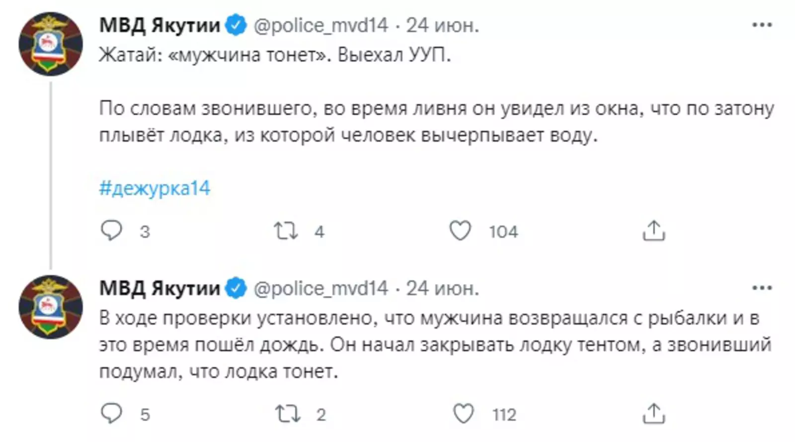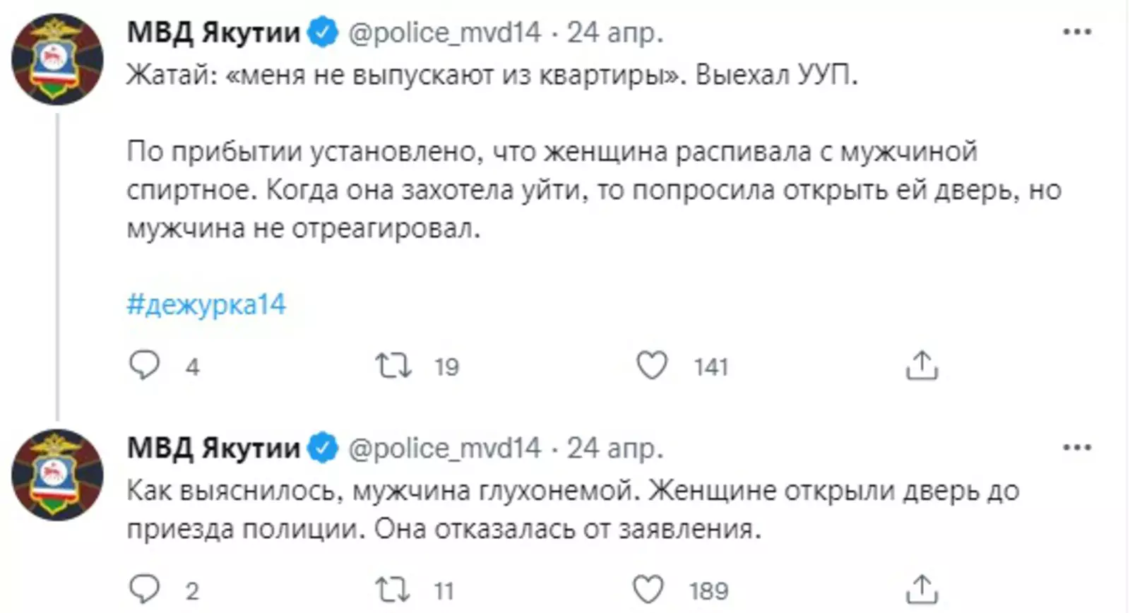 С тех пор забавная «дежурка» стала основным содержанием микроблога МВД Якутии. География проекта значительно расширилась, и кроме якутских здесь публикуются сообщения о незначительных преступлениях и просто нелепых вызовах со всей республики.