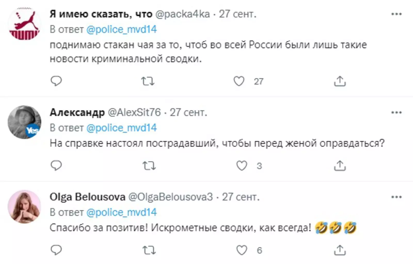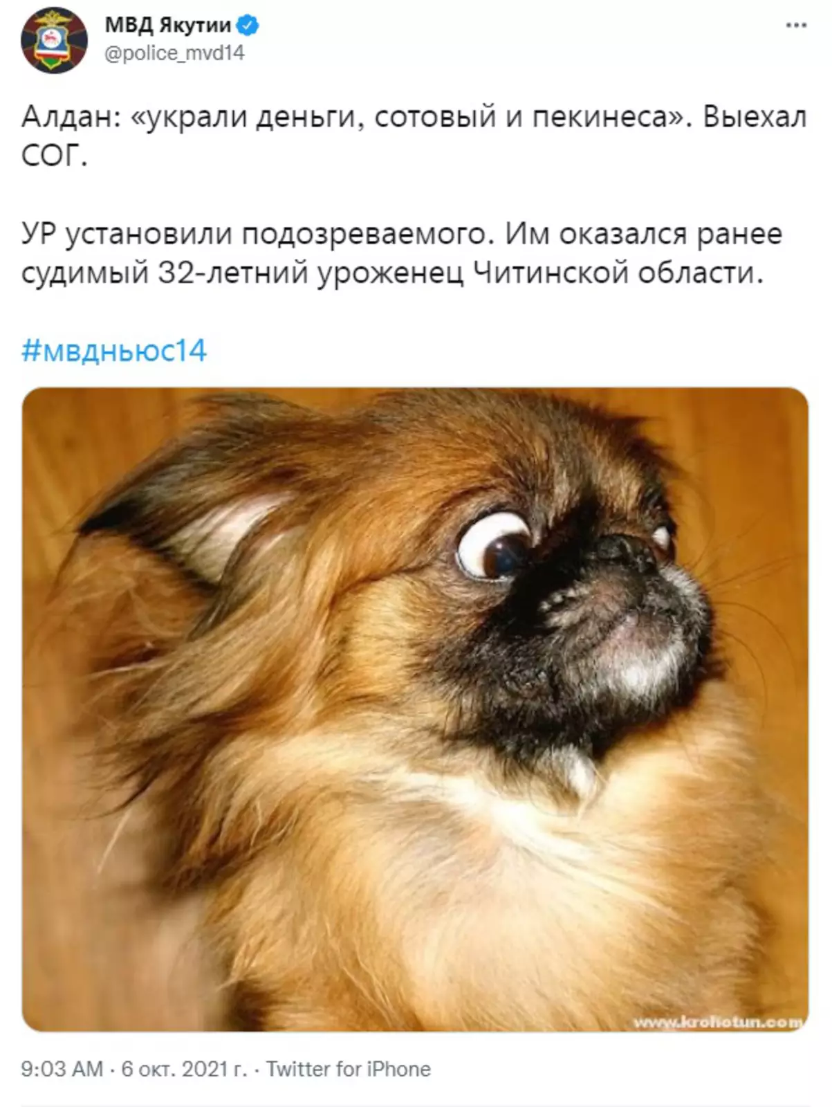 Такой необычно позитивный и при этом не казенный настрой для полицейского Twitter принес аккаунту МВД Якутии заслуженную славу в Рунете. У якутского МВД в соцсети появились и свои фанаты, которые регулярно выступают в комментариях с пожеланиями, чтобы криминальная хроника во всей России выглядела именно так, как в этом микроблоге — с «обслюнениями», фальсификацией синяков и воровством пекинесов как самыми страшными преступлениями.
