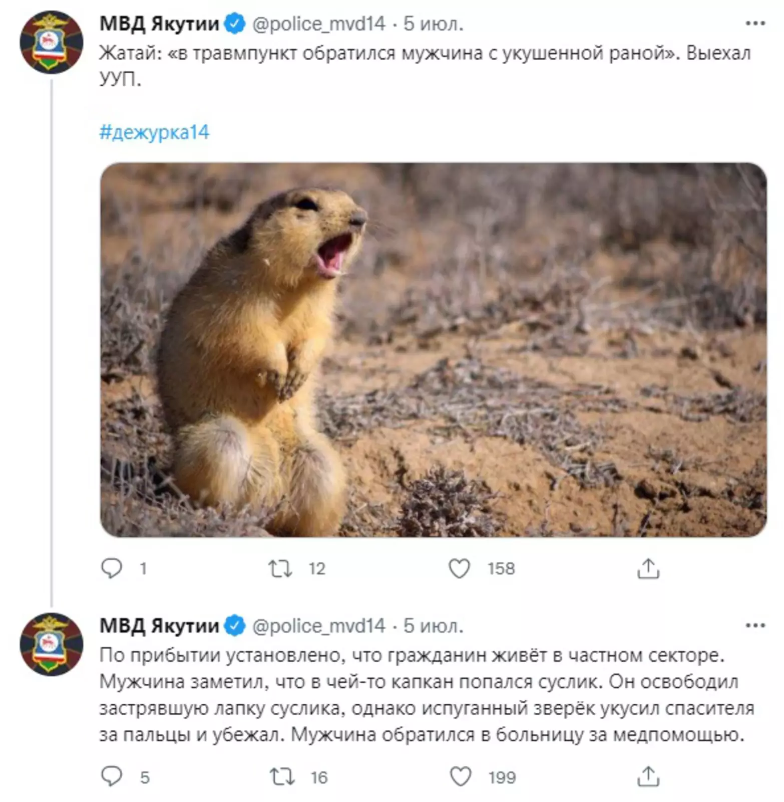 Одним из наиболее частых источников для этой хроники забавных происшествий стал отдел по поселку Жатай — северному пригороду Якутска. Отсюда в Twitter республиканского МВД в последнее время чаще всего поступает информация об укусах неблагодарных сусликов, о глухонемых, которые отказываются выпускать собутыльника из квартиры, о мнимых утопающих и других абсурдных происшествиях.