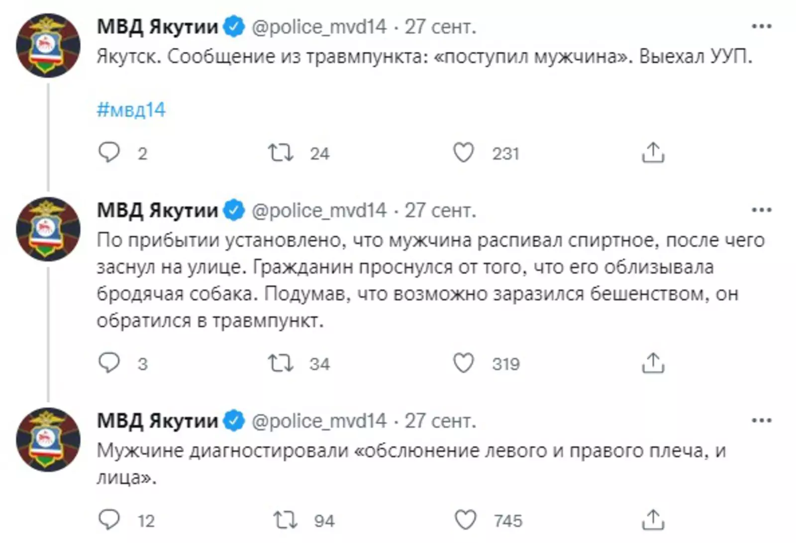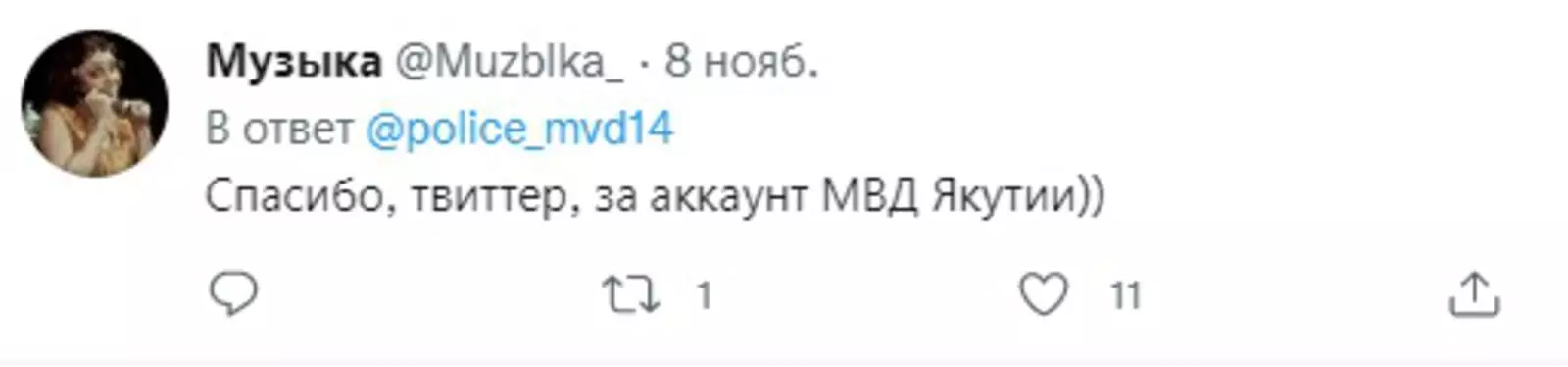 В День полиции, 10 ноября, «Ридус» не смог пройти мимо одного из самых оригинальных официальных аккаунтов российских органов правопорядка в социальных сетях. Им оказался аккаунт МВД по республике Якутия в Twitter.