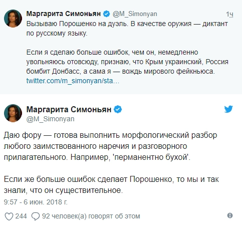 Главный редактор МИА «Россия сегодня» и телеканала RT Маргарита Симоньян после пререканий в СМИ с украинским президентом Петром Порошенко предложила ему пройти тест по русскому языку.
