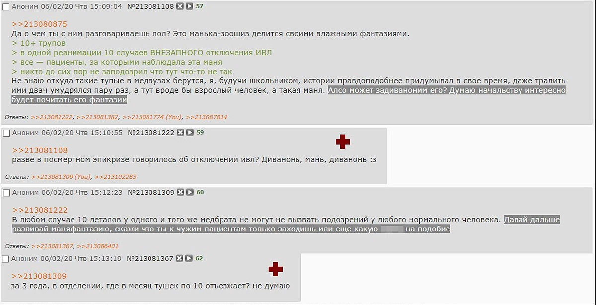 За 10+ трупов не посадили, нет, не нассав в утку, просто отключаю от ИВЛ и наблюдаю за агонией, очень забавно, как они глаза пучат и пытаются вдохнуть, но не получается. Меня не поймают, камер в палате нет, доктора заходят редко, на вход в палату магнитный замок, я продолжу делать то, что хочу, и хоть ты пеной изойди, — прокомментировал аноним, представившийся врачом больницы.