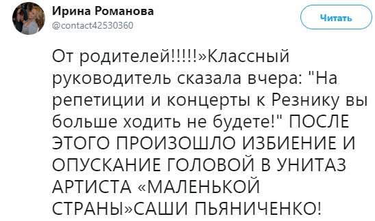 Ранее директор музыкального театра Ильи Резника Ирина Романова выложила в своем аккаунте в Instagram видео, на котором зафиксировано, как в школьном туалете группа учеников окунает мальчика головой в унитаз.