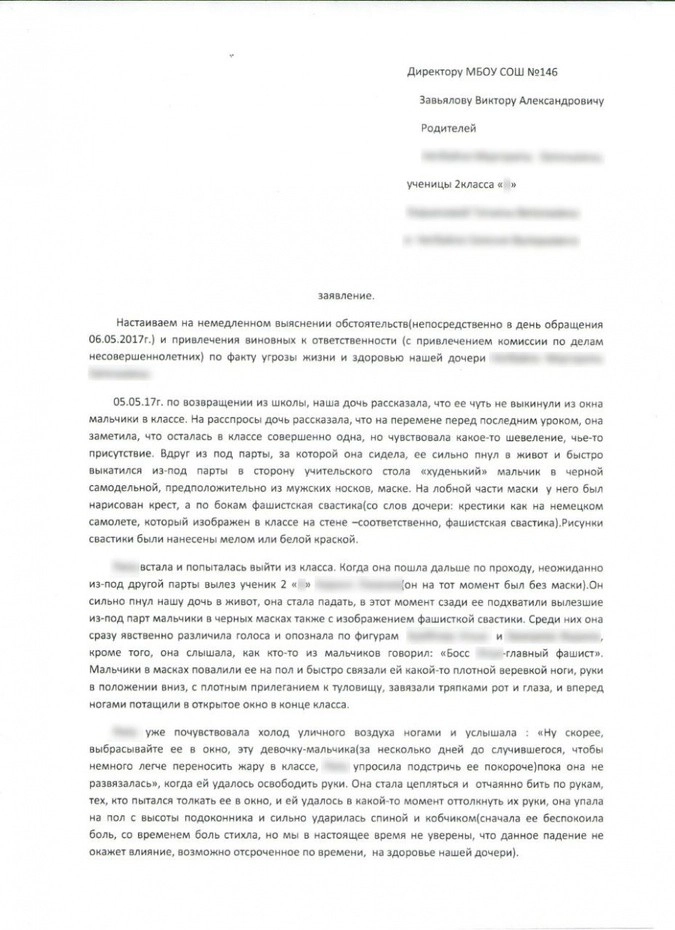 «Мальчики в масках повалили ее на пол и быстро связали ей какой-то плотной веревкой ноги, руки в положении вниз, с плотным прилеганием к туловищу, завязали тряпками рот и глаза и вперед ногами потащили в открытое окно в конце класса», — говорится в заявлении родительницы на имя директора школы.