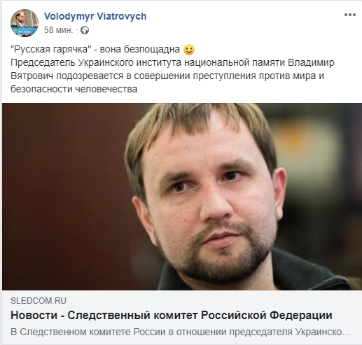 Следственный комитет России возбудил уголовное дело в отношении украинского историка — председателя Украинского института национальной памяти Владимира Вятровича. Он подозревается в реабилитации нацизма (ч. 2 ст. 354.1 УК РФ).