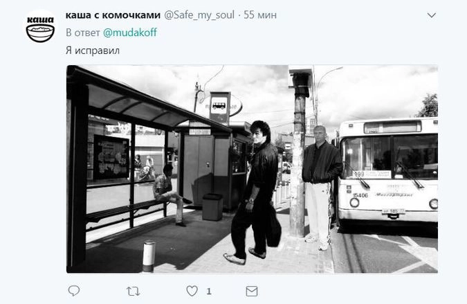 Вторая была опубликована в Twitter MDK. Там к снимку автобусной остановки в фоторедакторе добавили фигуру Виктора Цоя, который, как известно, погиб в результате лобового столкновения своего автомобиля с автобусом.