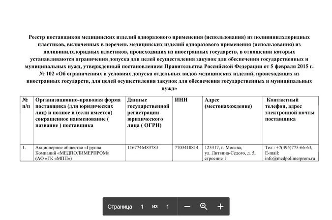Министерству промышленности и торговли РФ было поручено вести реестр активно инвестирующих в развитие локального производства компаний, у которых и будут преимущественно осуществляться госзакупки. 4 октября 2017 года Минпромторг утвердил перечень поставщиков медицинских пластиковых изделий для государства всего из одной компании — «Медполимерпрома».
