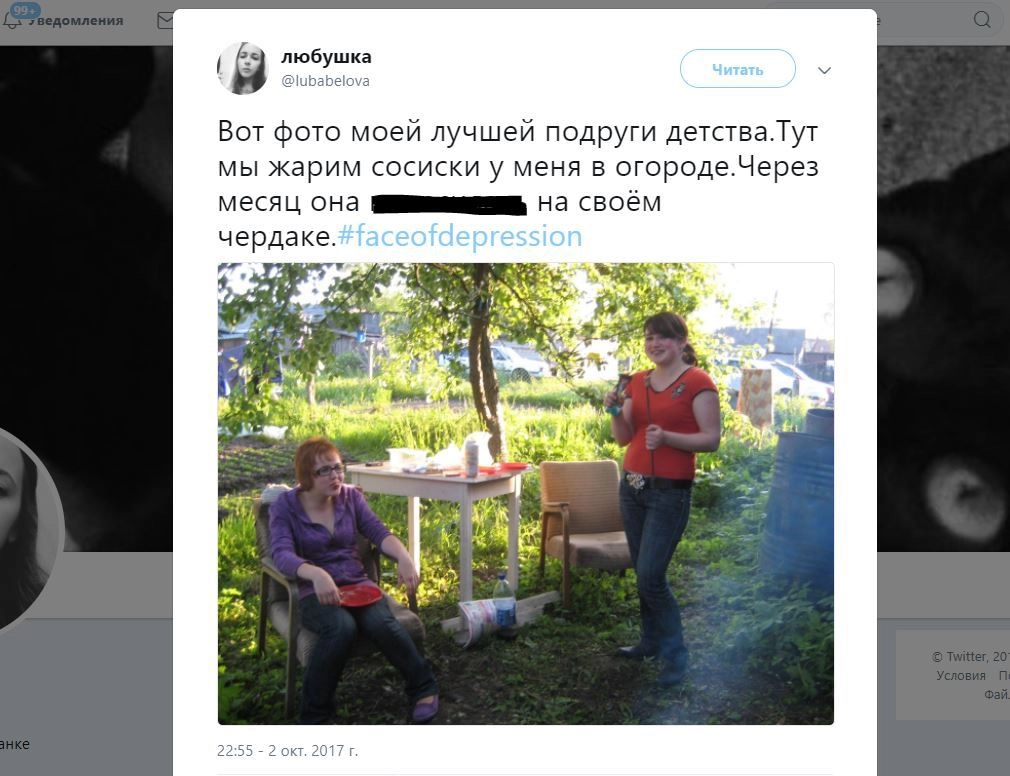В социальных сетях набрал популярность флешмоб #faceofdepression, в рамках которого пользователи делятся непримечательными на первый взгляд фотографиями людей в момент тяжелых жизненных ситуаций. В основном рассказывают про себя, но нередко — и про знакомых и родных, которые неожиданно для окружающих наложили на себя руки.