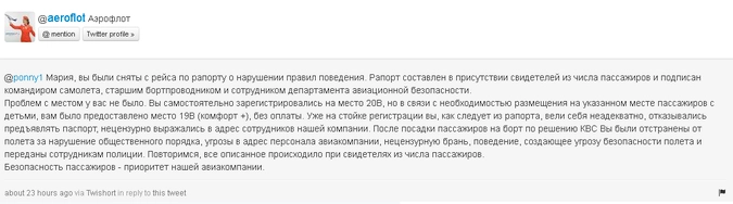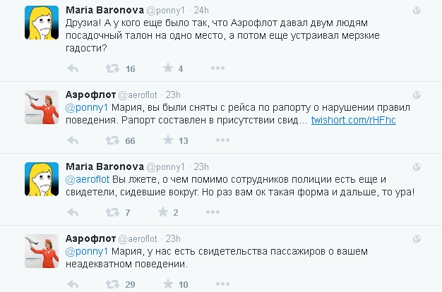 По словам представителей авиаперевозчика, Баронову пересадили на место повышенного комфорта, не требуя с нее доплаты, поскольку возникла необходимость размещения пассажиров с детьми. В свою очередь, девушка начала вести себя неадекватно – отказывалась предъявлять паспорт и нецензурно выражалась в адрес сотрудников «Аэрофлота».