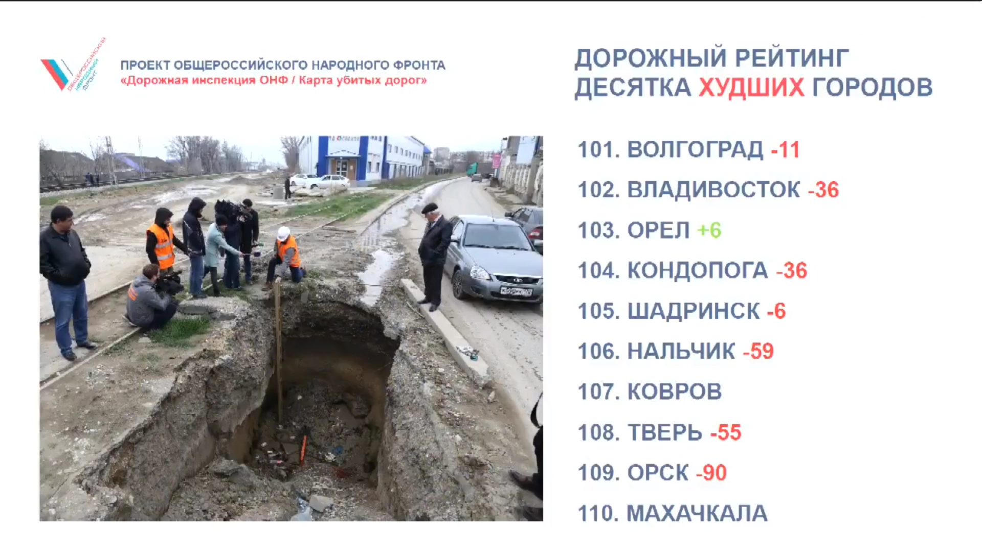 Проект Общероссийского народного фронта «Дорожная инспекция ОНФ/Карта убитых дорог» около восьми месяцев собирал отзывы граждан со всех регионов страны о состоянии дорожного покрытия.