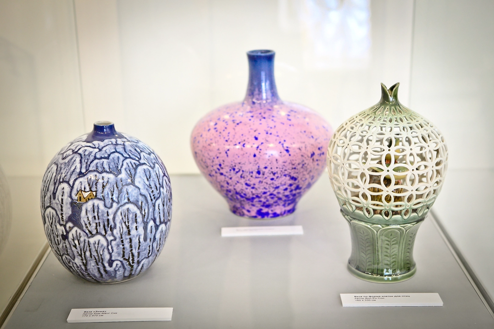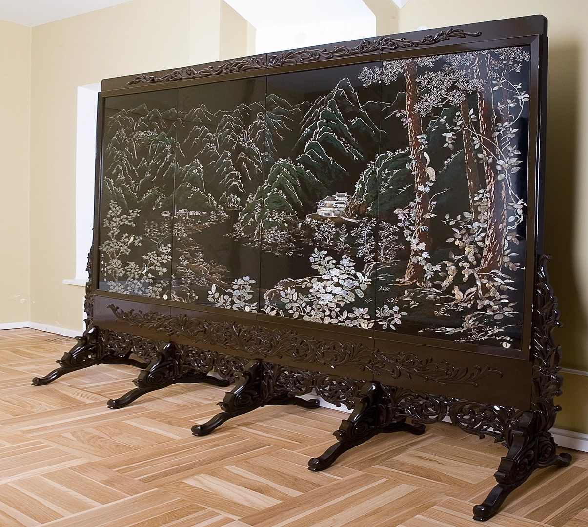 Среди особенно ценных экспонатов – декоративный деревянный экран, подарок ЦК КПСС от президента КНДР Ким Ир Сена. Экран состоит из четырех отдельных пластин, украшенных с обеих сторон художественной инкрустацией перламутром.
