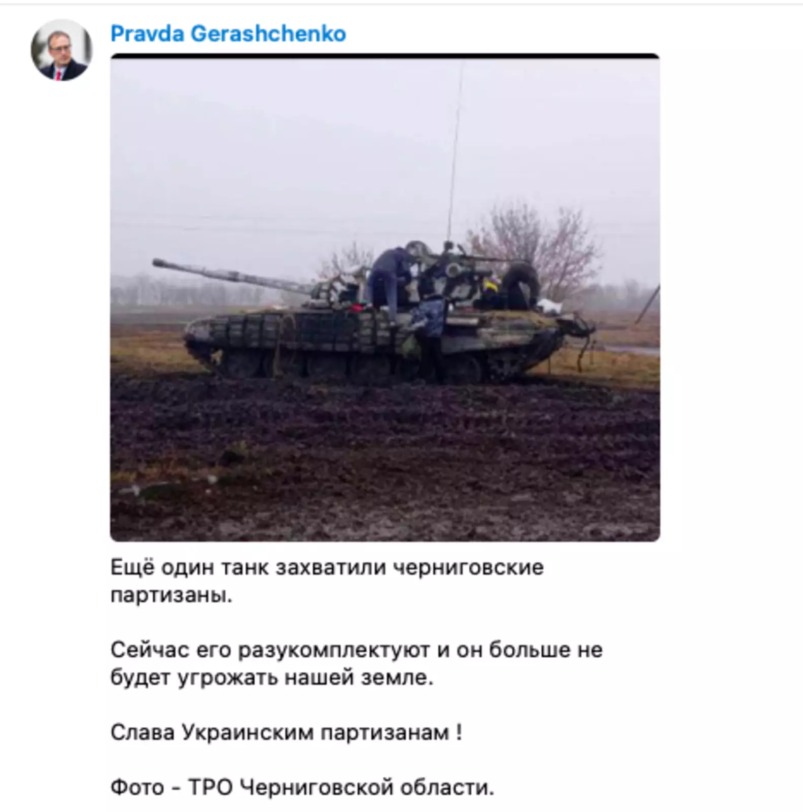 Внештатный советник министра внутренних дел Украины Антон Геращенко опубликовал очередной фейк о захвате бойцами территориальной обороны российского танка.