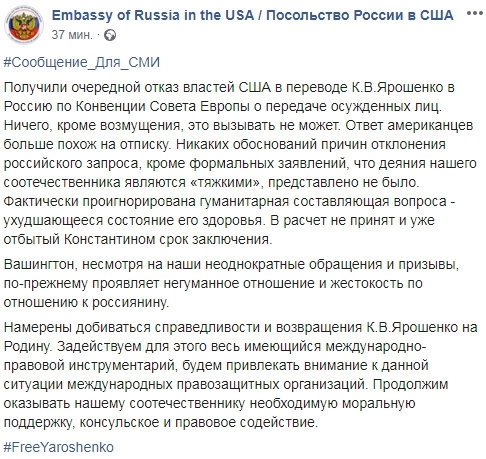 «Получили очередной отказ властей США в переводе К. В. Ярошенко в Россию по Конвенции Совета Европы о передаче осужденных лиц. Ничего, кроме возмущения, это вызывать не может. Ответ американцев больше похож на отписку. Никаких обоснований причин отклонения российского запроса, кроме формальных заявлений, что деяния нашего соотечественника являются „тяжкими“, представлено не было. Фактически проигнорирована гуманитарная составляющая вопроса — ухудшающееся состояние его здоровья», — заявили российские дипломаты. Сообщение опубликовано на странице посольства РФ в Facebook.