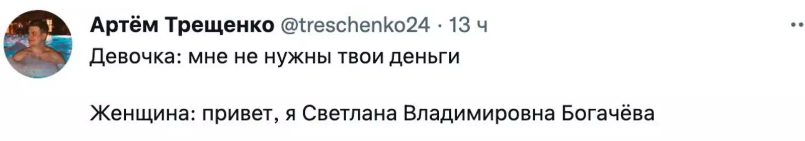 На протяжении вот уже трех дней на просторах соцсетей только и разговоров, что о Светлане Владимировне Богачевой. Героиня вирусного треда стала настоящей звездой Рунета после того, как о ней у себя в блоге рассказала стендаперша Татьяна Щукина. Богачева на протяжении трех лет обманывала ее, создавая вокруг своей личности легенды и притворяясь другими людьми.