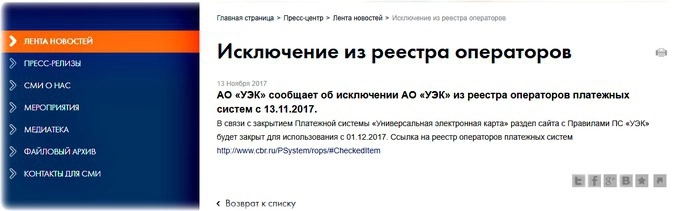 В декабре 2016 года Госдума приняла закон, и президент Путин его подписал, об отмене универсальной электронной карты. АО «Универсальная электронная карта» официально прекратило существование в ноябре 2017 года.