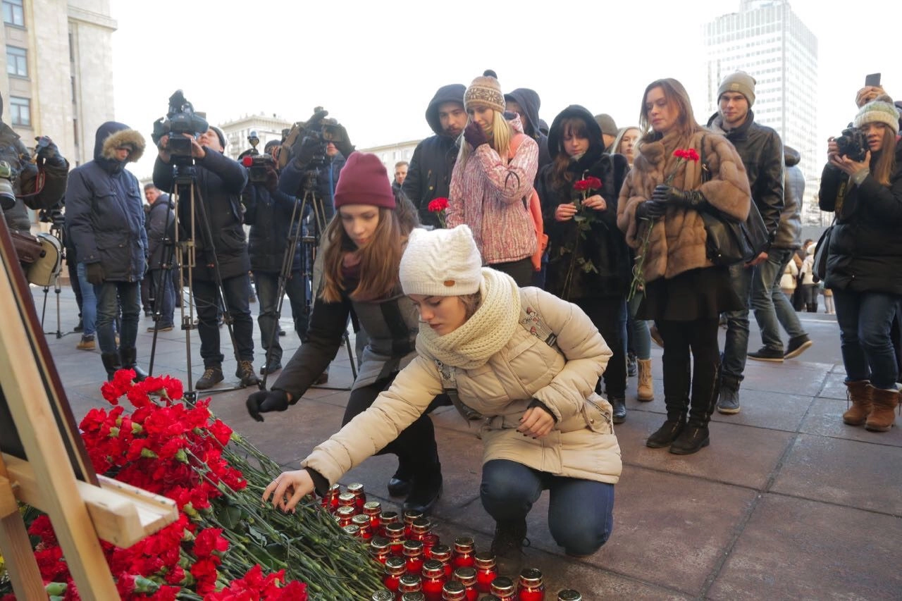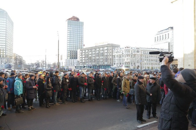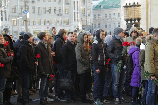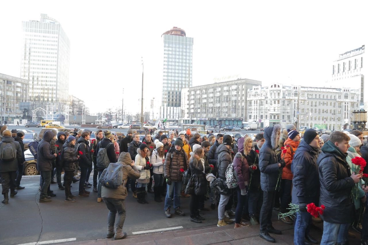 Студенты вузов Москвы собрались у здания МИД, чтобы почтить память убитого дипломата Андрея Карлова. В траурном возложении цветов приняли участие 350 человек.