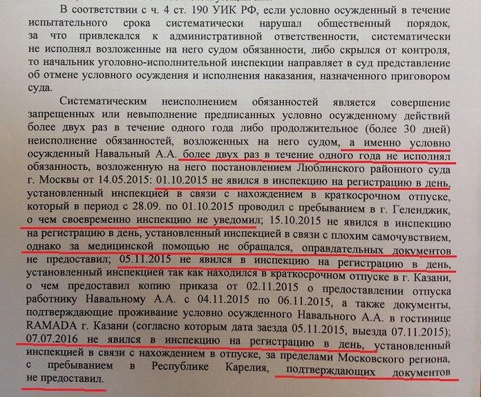 Более двух раз в течение одного года Навальный не исполнял обязанности, возложенные на него постановлением Люблинского районного суда, а также 15 октября, 5 ноября 2015 года и 7 июля не явился в инспекцию, своевременно не уведомил и подтверждающих необходимость отсутствия документов не предоставил.