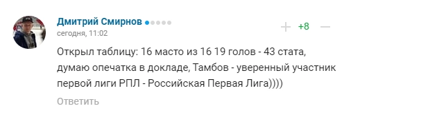 «Отдельно остановлюсь на футболе. Профессиональный футбольный клуб «Тамбов» за короткий срок прошел путь от середнячка второй лиги до уверенного участника российской Премьер-лиги. Здесь есть победы, есть промахи, имеются и проблемы, которые в настоящее время решаются, в том числе, с участием региональной власти. Надо отметить, что и в Тамбовской области футбол — это, конечно, самый популярный вид спорта. Наша гордость — региональный центр «Академия футбола». За последние годы специалисты Академии подготовили известных в стране и за ее пределами спортсменов: Юрия Жиркова (заслуженный мастер спорта России, игрок сборной России и ФК «Зенит»), Артема Архипова (ФК «Шахтер» Солигорск, чемпион Белоруссии), Владислава Лепехина (ФК «Динамо» Москва), Ивана Котельникова (ФК «Локомотив»), Никиту Иосифова (ФК «Локомотив»)", — говорит Никитин в своем докладе.Но почему-то во время выступления губернатор забыл рассказать о том, что в конце минувшего сезона футбольный клуб «Тамбов» лишился профессионального статуса, из 30 игр в РПЛ он проиграл 23 и занял уверенное последнее место с 13 очками.