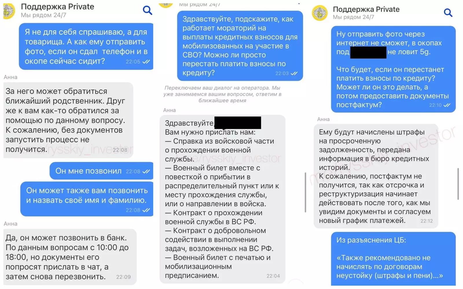 «Закон приняли недавно, поэтому в некоторых случаях обращения клиентов случаются ошибки со стороны сотрудников, мы оперативно их устраняем и параллельно работаем над оптимизацией процессов, упрощаем процедуры подтверждения и выдачи кредитных каникул, чтобы родственникам мобилизованных клиентов было проще получить отсрочку».Ранее Центробанк давал подробное разъяснение российским банкам о предоставлении кредитных каникул мобилизованным россиянам.