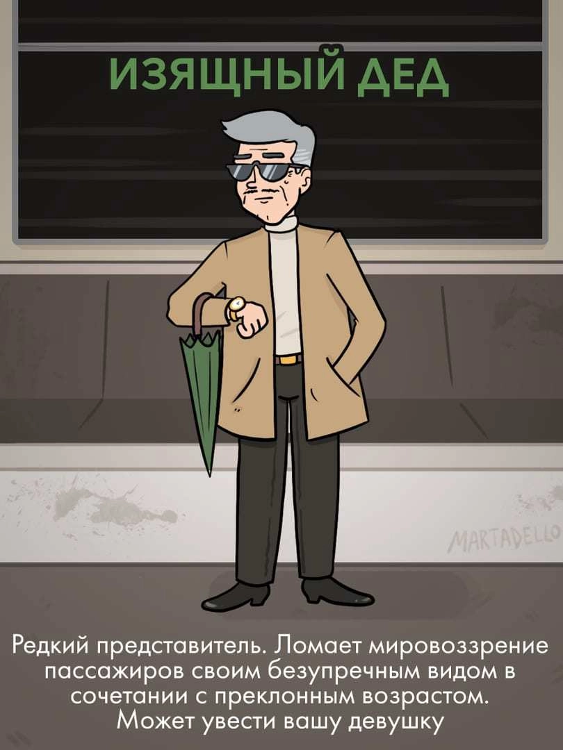 Те, кто каждый день передвигается на метро, считают, что за такой общественный транспорт должны доплачивать им. И хоть новые вагоны оснащены кондиционерами, электронным табло, местом для зарядки телефонов и удобными сиденьями, люди в них ездят всё те же, что и в старых. Художник, известный в интернете под ником Martadello, решил нарисовать типичных пассажиров метрополитена, которых можно встретить там ежедневно. А может, вы один из них? Кстати, этот иллюстратор уже рисовал, какими бывают дачники, тоже смешно получилось. Теперь давайте рассмотрим персонажей из подземки.