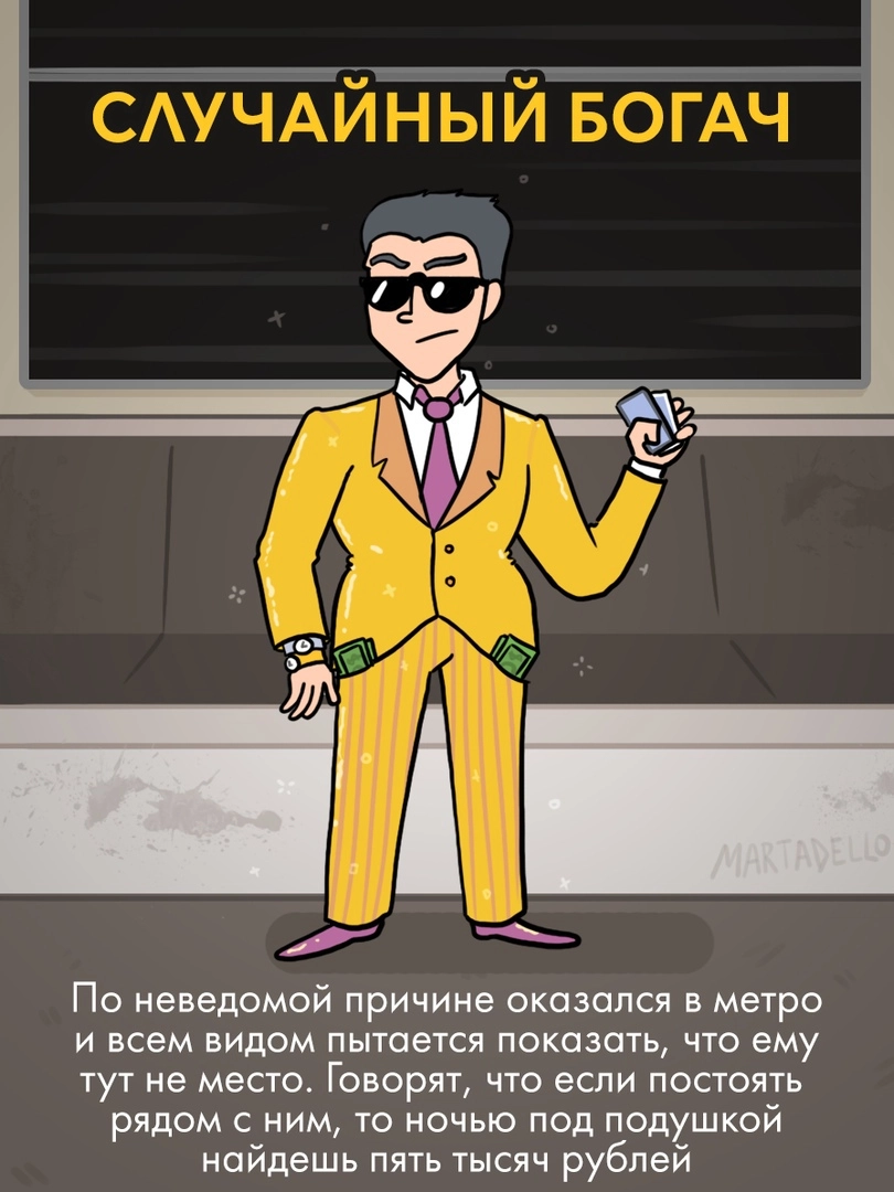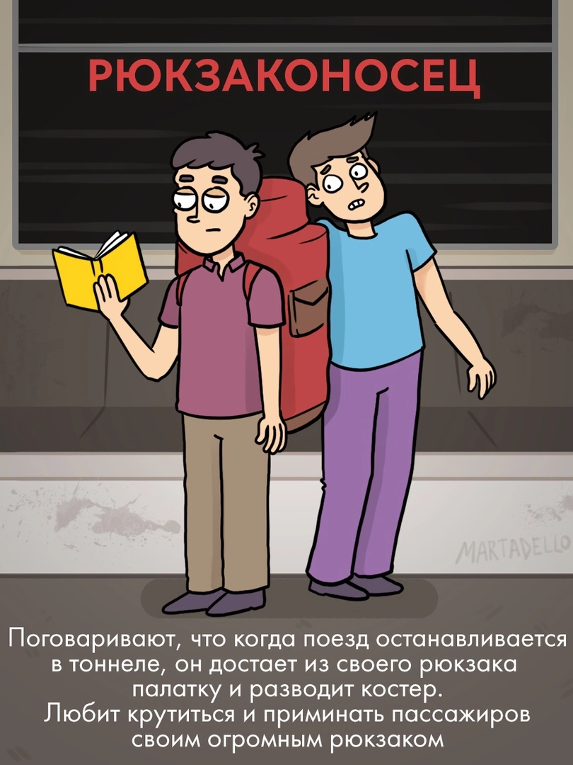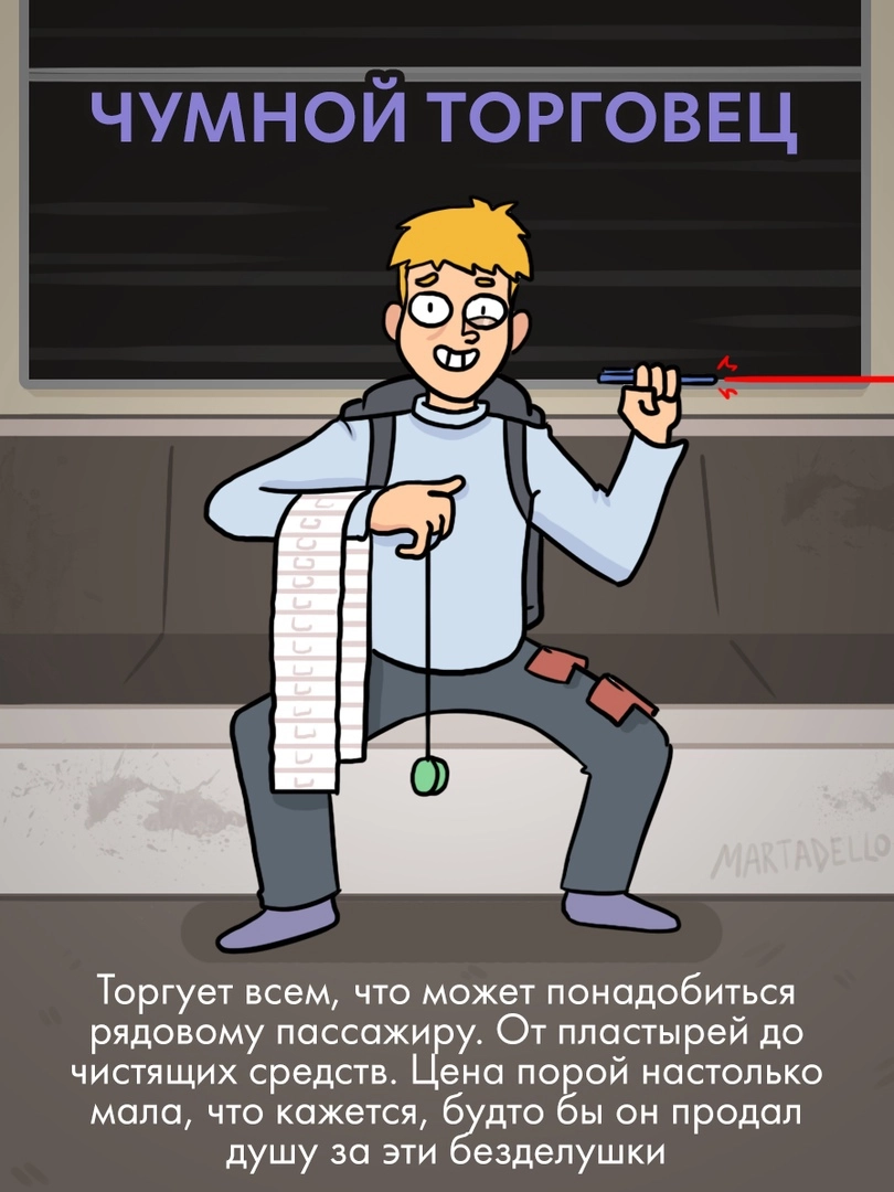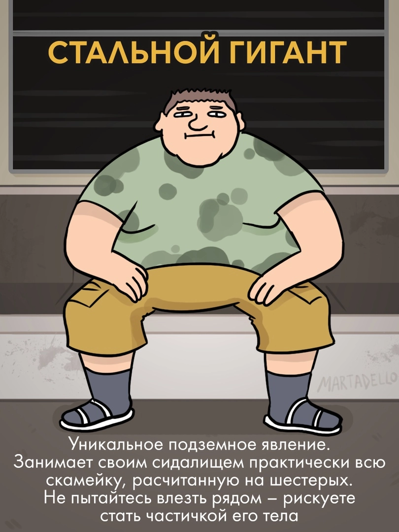 Недавно художник, известный в интернете под ником Martadello, решил нарисовать типичных пассажиров метрополитена, которых можно встретить там ежедневно. «Ридус» публиковал героев первой серии, которых представляли Подземный ковбой, Бабка с тележкой, Школьная орда, Изящный дед и Пакетчица. Забавные карикатуры имели большой успех среди интернет-пользователей, которые предложили свои варианты. Автор прислушался и представил публике вторую часть посетителей подземки, в которую вошли Ароматный курьер, Тоннельный бард, Кислый странник и другие.