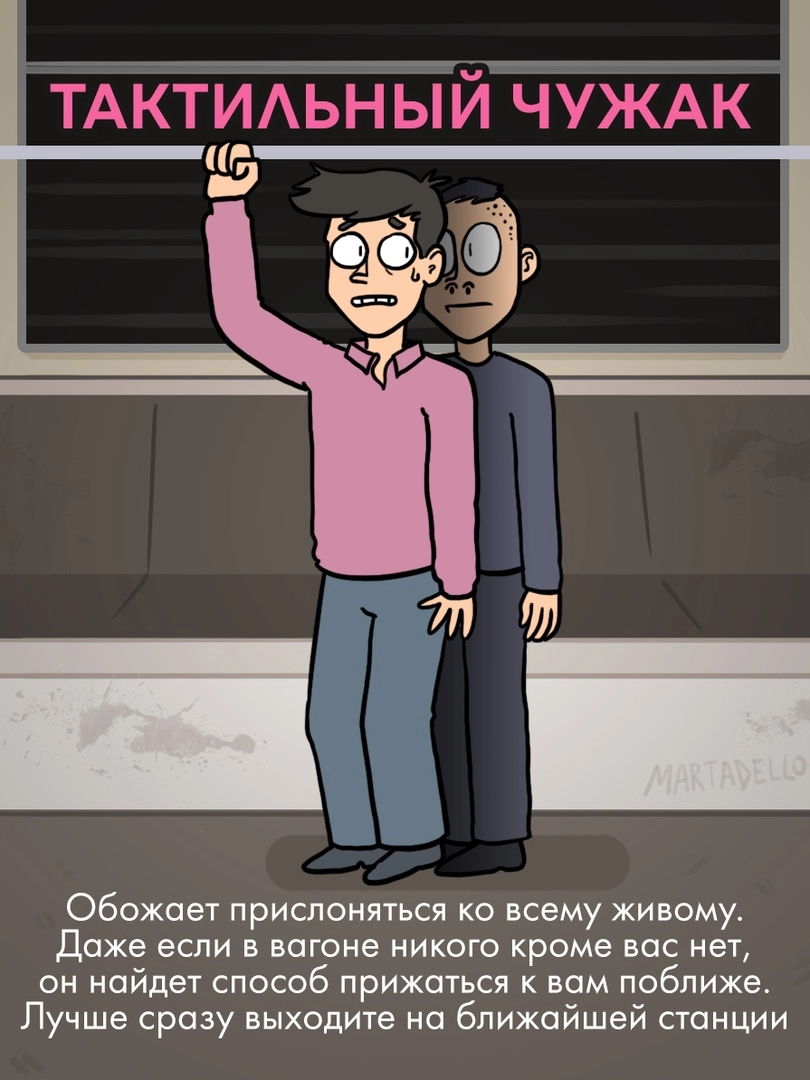 Обожает прислоняться ко всему живому. Даже если в вагоне никого, кроме вас, нет, он найдёт способ прижаться к вам поближе. Лучше сразу выходите на ближайшей станции.