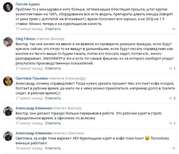 Горячие споры пользователи ведут и в комментариях под новостями. Многие считают, что наказывать за отлучки только курильщиков - несправедливо. Ведь другие сотрудники могут отвлекаться на кофе и перекусы или проводить много времени в туалете.