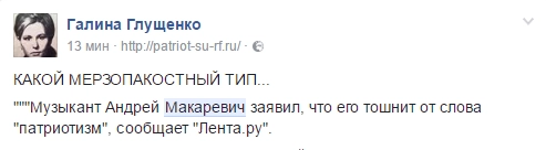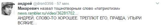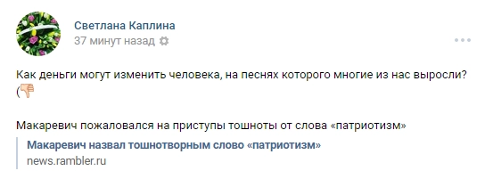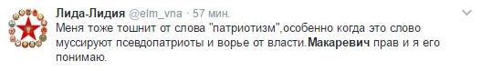 Впрочем, присутствуют в соцсетях и высказывания в поддержку артиста. Сторонники Макаревича отмечают, что само слово «патриотизм» не вызывает у них рвотных позывов, тогда как постоянное упоминание этой темы «псевдопатриотами» их действительно раздражает.