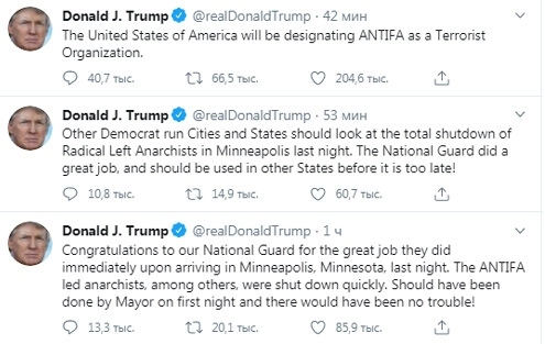 В Миннеаполисе ввели комендантский час. В город вошли подразделения Национальной гвардии. Около пяти тысяч бойцов приступили к разгону протестующих. Дональд Трамп винит в организации беспорядков левых анархистов. По его словам, власти Соединенных Штатов собираются причислить к террористическим организациям международное антифашистское движение ANTIFA.