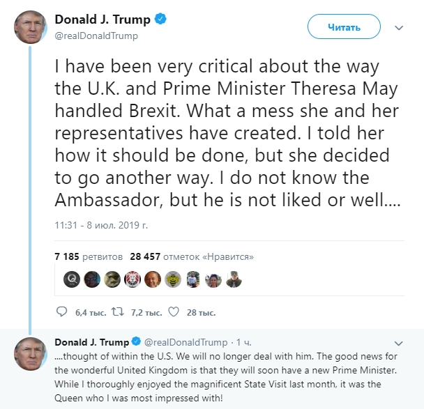 Президент США Дональд Трамп резко раскритиковал в своем Twitter уходящую в отставку премьер-министра Великобритании Терезу Мэй и британского посла в Вашингтоне Кима Дэррока.