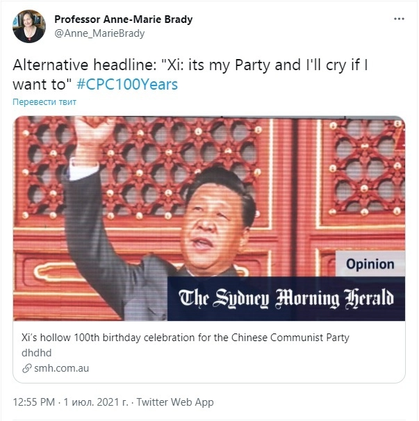 По словам Брэди, она обнаружила свой микроблог временно заблокированным после того, как во время празднования столетия Коммунистической партии Китая 1 июля опубликовала достаточно ехидный пост в адрес пекинского лидера.