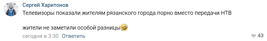 В городе Новомичуринске Рязанской области на местном телеканале НТВ вместо передачи «Место встречи» показали порнографический фильм. Зрители были удивлены.